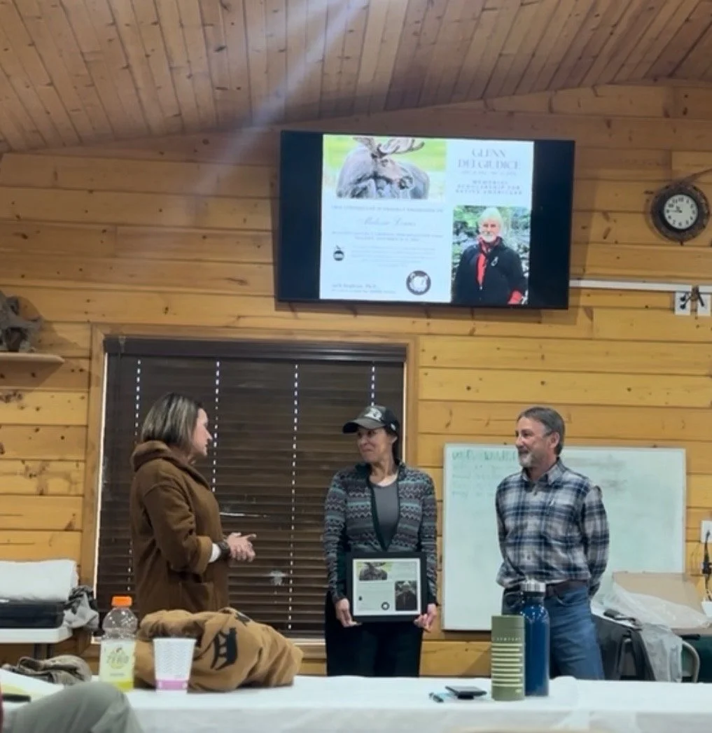Recent recipient of the Glenn DelGiudice scholarship, Melissa Lewis, is shown here accepting the award from Dave Garshelis and Sal.